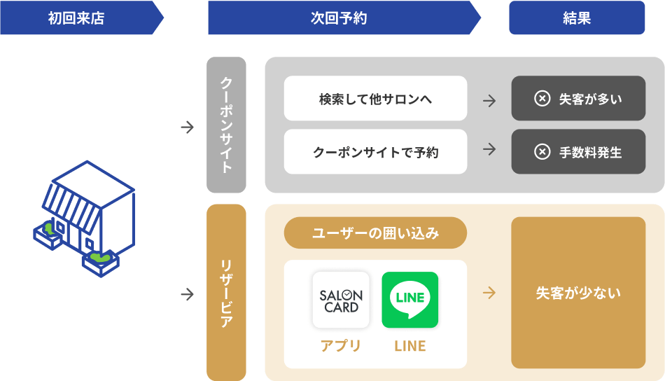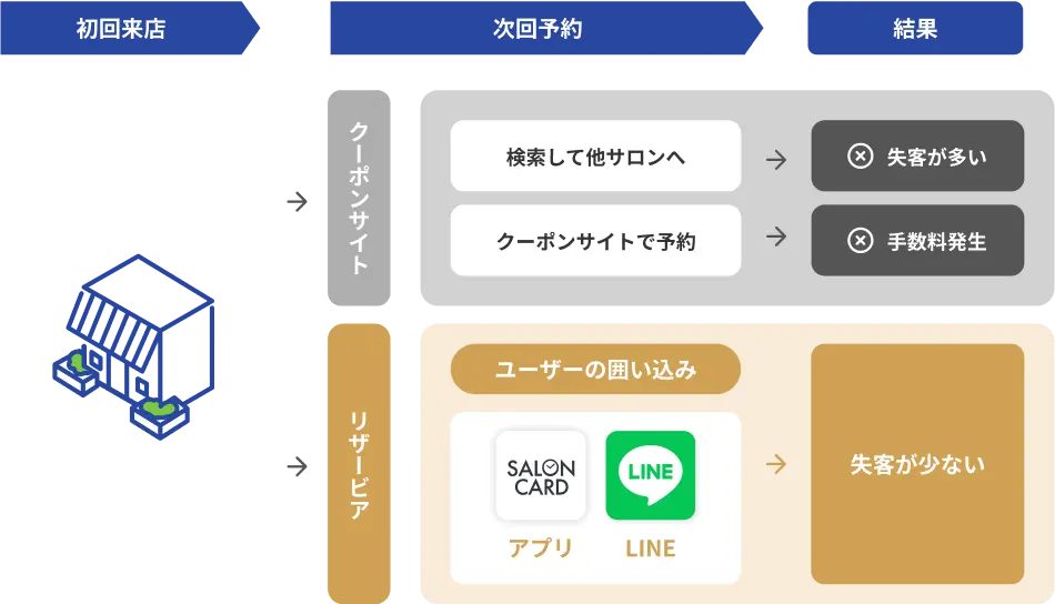 リピート予約を増やし、集客コストを減らせます アプリ・LINEの活用で リピート率が上がります 再来店してもらうためには、お客様がクーポンサイトやwebで検索せずに予約できることが大切です。 次回予約をアプリやLINEからしてもらうことで、リピート率アップにつながります。